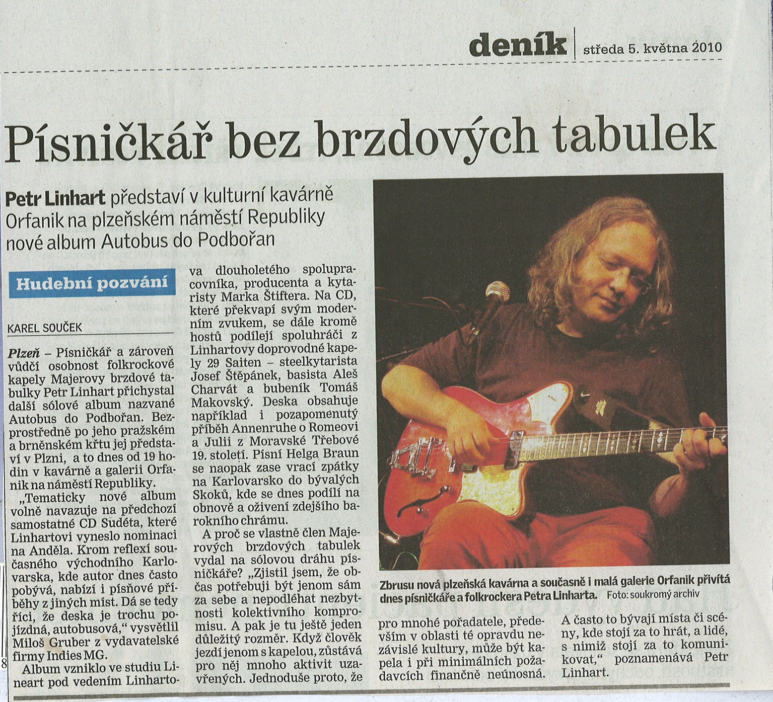 Plzeňský deník 5.5.2010, Písničkář bez brzdových tabulek, článek Karla Součka